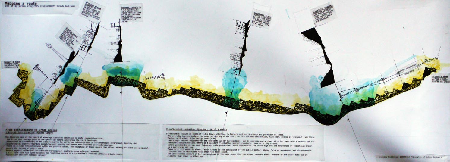 the only project to have done the route backwards as in, from where the person attends classes [fada] to where they sleep. an interesting approach, but why? this should have been explained. excellent unpacking of task 1 -- protection= shelter= hoamage= retreat? delightful equation, but what does hoamage mean? things get better in unfinished sympathy. lines like the everyday journey sculpts the urban perception of the user; factors include desitnation [sic], time span, method of transport (all these factors will affect urban design principles) are a joy to read. and the text gets even better. the only mild criticism is, this could have been explored graphically as an added layer with plans, sections, architectonics et al. that being said, it doesn’t take away from the strength of the text. be mindful of spelling errors. the journey from fada through brixton, boysens, southdale flats, kliprivier to home is well rendered with alluring + charming sections enhanced with a textual layer. the morphology of the city, as a plan, draws one in, but this could have been taken further from mere “fine art” illustration to actual city grain + morphology. also a timeline + distance layer would have added more value to an already rich and splendid piece of work. this is an example whereby the expression of the work justifies not respecting the format. excellent work. keep it up.